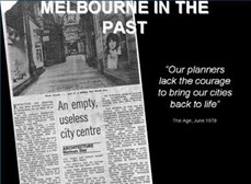 في عام ١٩٧٨م، انتقد صحفي محلي بلديةَ ملبورن بأسلوب لاذع، وزعم أن سياساتها المتبعة ليست فاعلة، وأن مركز مدينة ملبورن "فارغ وغير مفيد"، وعبّر بأن "مخططيها يفتقرون إلى الشجاعة اللازمة لإعادة المدينة إلى الحياة".